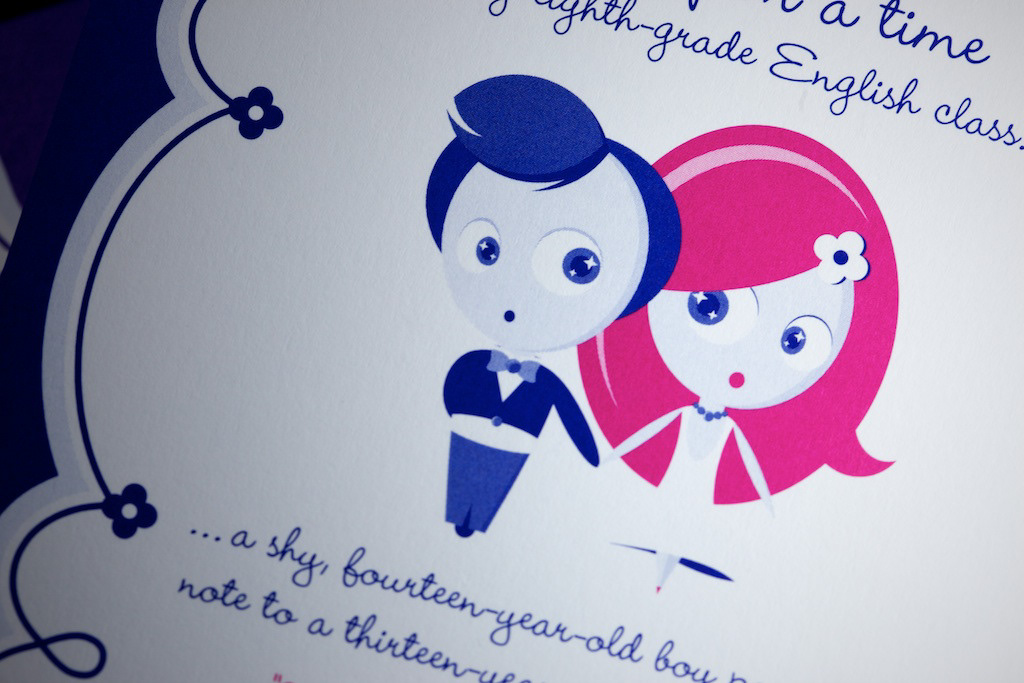 Wedding invitation for Katherine and Chris, a couple who spoke of marriage in eighth-grade English class, and actually tied the knot 25 years later.